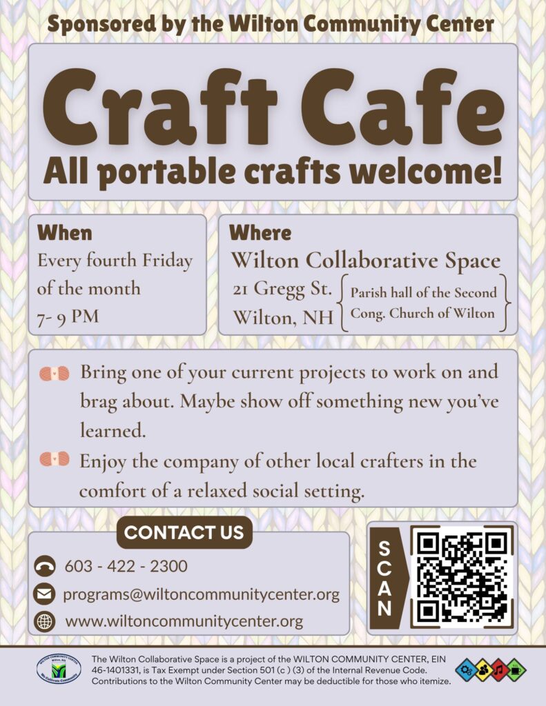 At the Wilton Community Center’s monthly Craft Café you will find plenty of space to spread out and craft- bring your table loom, spinning wheel, knitting, crochet, etc. We have a wide selection of specialty teas to drink hot or cold. Wear your comfiest outfit – come early, stay late – build up your local community of fiber artists.
